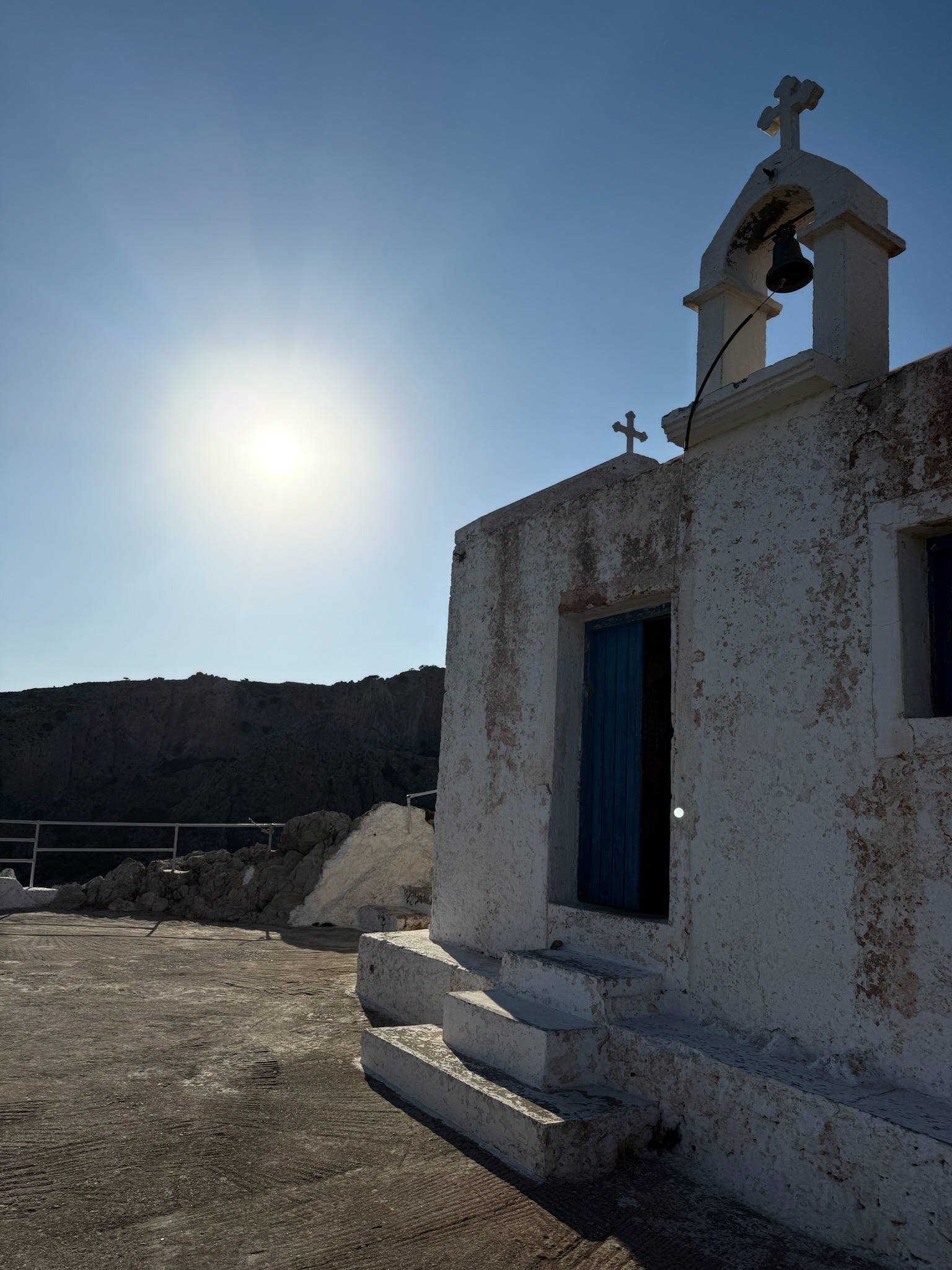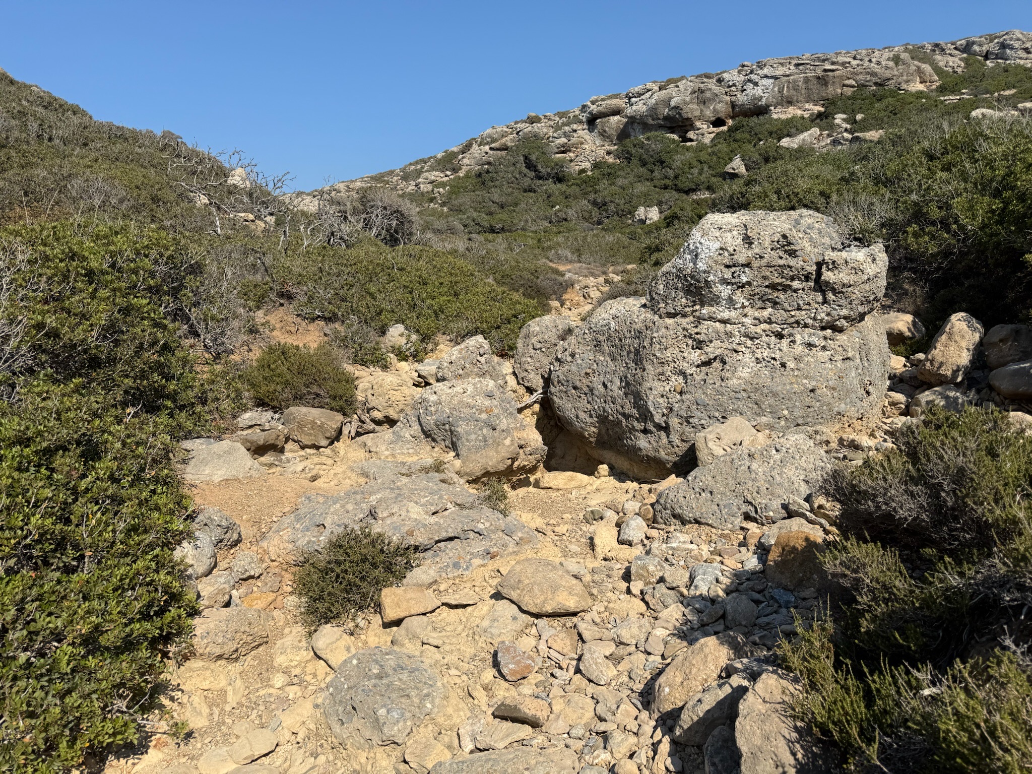 Start at the top of Pefki, make your way through rocky terrain until you reach the bottom of the chapel rock — there is water here if you need it.
